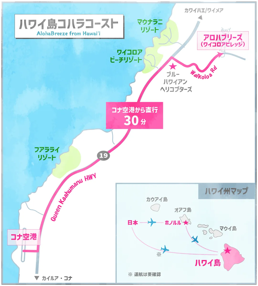 アロハブリーズはハワイ島のコナ空港から車で直行30分。19号線から山手に上がったワイコロア・ビレッジの住宅街にあります。標高230mの丘に位置する町です(海岸沿いのワイコロア・ビーチ・リゾート内ではございません) ご予約時に詳細な道案内をお渡しします。